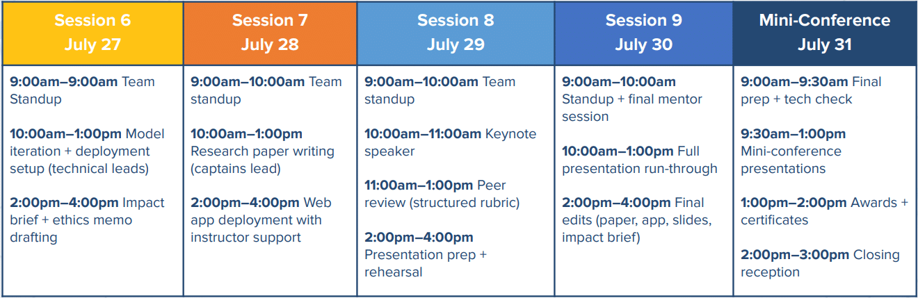 Week 2 focuses on building, refining, and presenting each team’s AI project. Students iterate on their models, deploy a working web application, and develop a full research paper alongside an impact brief and ethics analysis. The week culminates in a live, judged mini-conference where teams present their work, demonstrating both their technical solution and its real-world significance.
